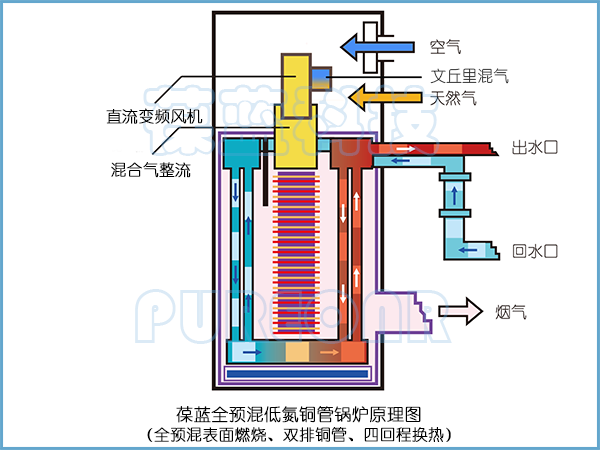 葆藍翅片銅管鍋爐四回程即使式換熱結構,燃燒室、次冷凝室、主冷凝室三室分離結構,壽命超長,導熱快,加熱精準。